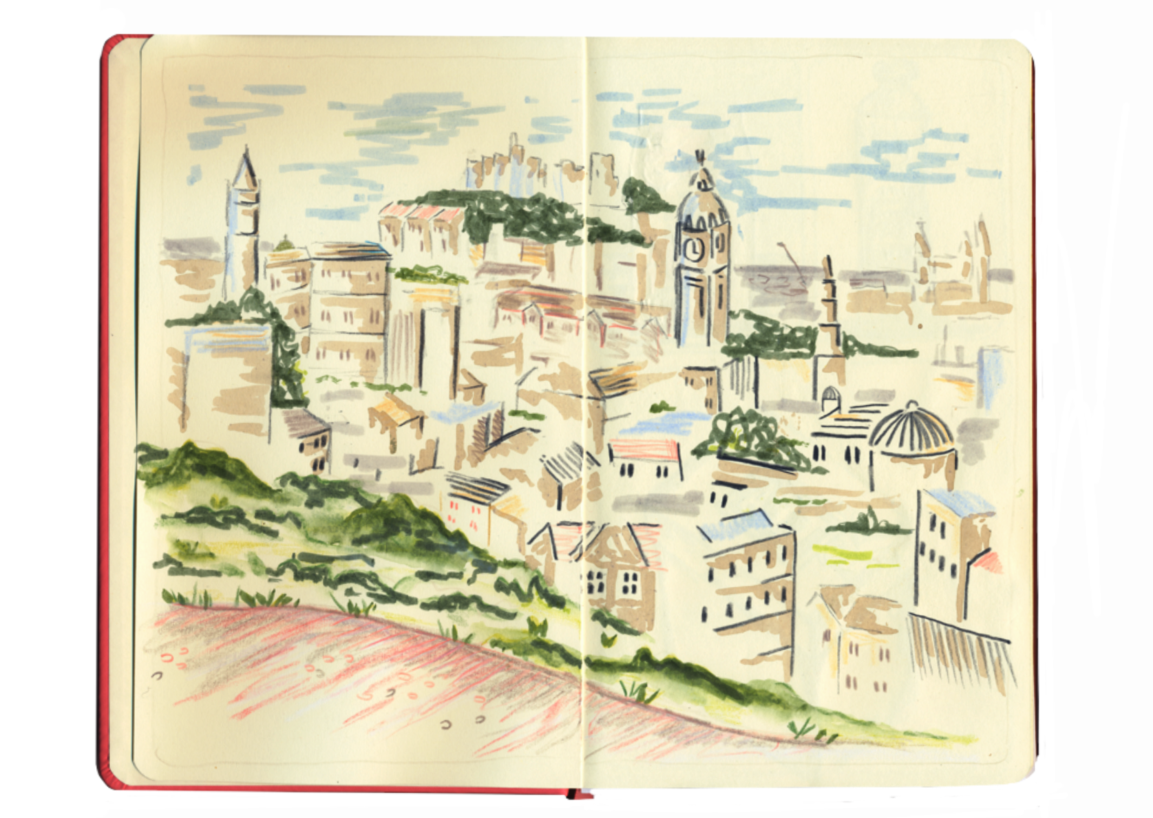 Artwork created with water-based markers, watercolour, gouache, coloured pencil and pastels